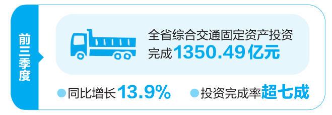 今年1月召开的全省交通运输工作会议强调,加快完善服务国家战略的综合立体交通网络。重大项目建设高歌猛进的背后,是全省综合交通投资的强劲支撑。前三季度,全省综合交通固定资产投资完成1350.49亿元,同比增长13.9%,完成年初制定目标1800亿元的75.0%。