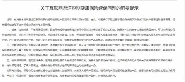 新规落地后,“不保证续保”无疑将对消费者选购保险带来影响。银保监会此前发布的《关于互联网渠道短期健康保险续保问题的消费提示》指出,目前网销短期健康保险的合同中虽然对续保作出了相应的约定,满足条件的消费者在保险期间届满时,可以向保险公司申请继续投保,但这并不等同于保证续保。对于非保证续保的产品,保险公司可能会出现停售、调整费率或推出替代的新产品等情况,届时保险消费者将会面临不能续保的风险。