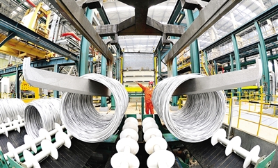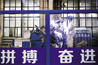 东北特钢集团大连生产基地内,通红的钢材在轧机上循序穿行,车间内的工人加班加点地干活,小白板上记录着每个人的工作量。
