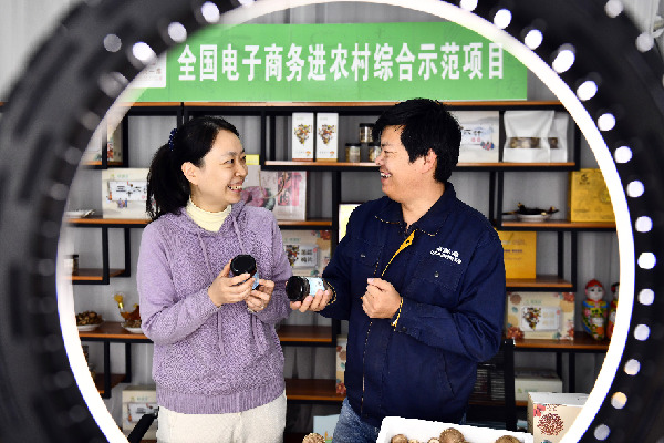 11月18日,在惠民县现代农业产业园食用菌示范园,主播在直播销售香菇产品。