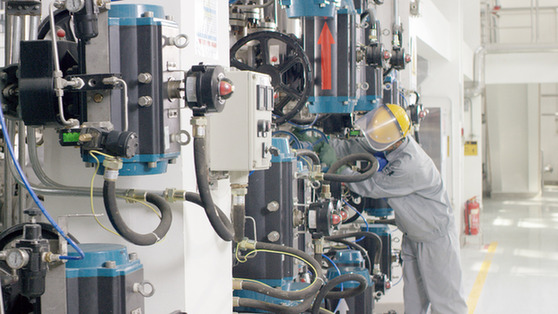 中国节能集团万润公司工人在生产车间作业。资料照片