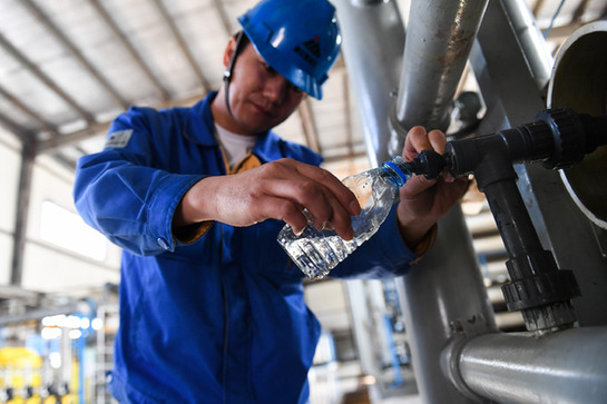 国家能源集团旗下公司废水处理中心,一名工作人员展示经过处理后的污水。记者 刘磊 摄