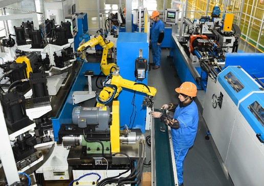 2月14日,在位于吴兴区八里店镇的金洲管道科技股份有限公司,工作人员和智能机器人协作生产不锈钢管件。