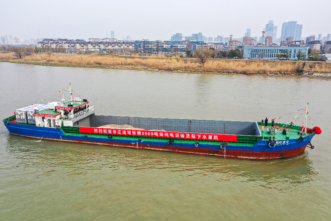 2月22日,“船联1号”电动货船在长江南京段航行(无人机照片)。 当日,长江流域首艘3000吨级纯电动货船“船联1号”在南京首航。该船由原来总载重3000吨位的燃油货船改造而成,把电能作为整艘船的唯一能源,实现零排放、低噪音、无污染。(新华社)