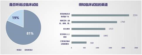 《报告》数据显示,在5382份调研问卷中,81%的调研对象均听说过临床试验,但通过医院、医生以及医学相关人员渠道占比为66%,这反映出,对于一般大众而言,信息获取渠道的“门槛”相对较高;在保证专业化服务基础上,大众需要更便捷的信息获取和沟通渠道。