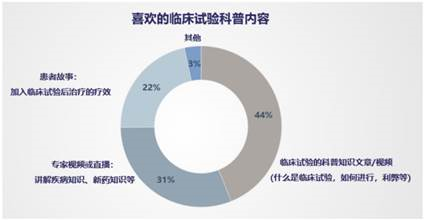 而在“喜欢的科普方式”中,38%的调研者喜欢科普手册或电子书,31%的调研者喜欢科普视频,18%的调研者喜欢专家讲座或直播,13%的调研者喜欢科普漫画。在“喜欢的临床试验科普内容”中,合计有75%的调研受众表示喜欢临床试验的科普知识文章/视频(什么是临床试验、如何进行、有何利弊等),以及专家视频或直播讲解疾病知识、新药知识等。