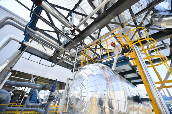 工作人员在陕西延长石油榆林煤化有限公司查看二氧化碳捕集装置运行情况。记者 张博文 摄